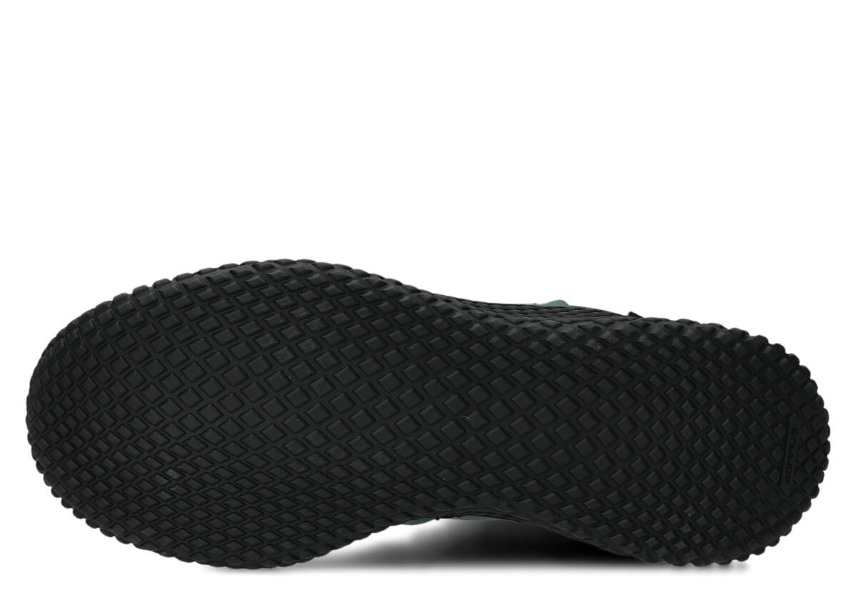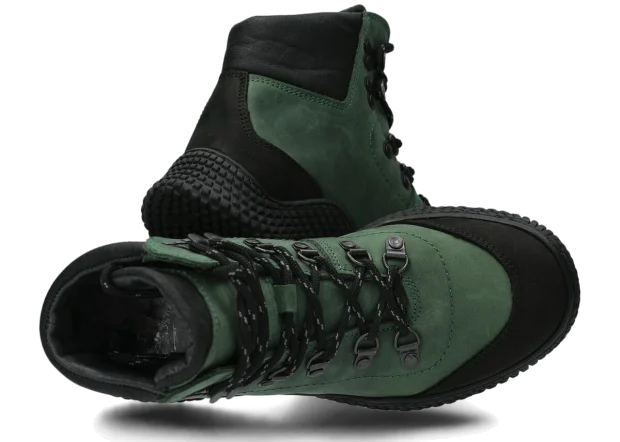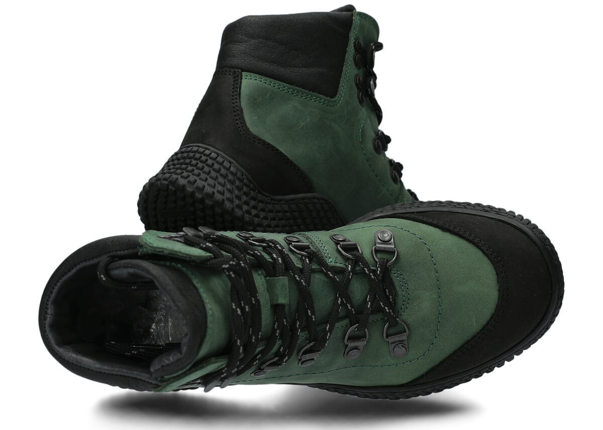 Svršek tvořený kombinací dvou druhů crazy kůže, dominantní zelená přírodní crazy kůže v kombinaci s černými vložkami na špičce, patě a límci vytváří velmi charakteristický městský-outdoorový vzhled. Silná, masitá, olejovaná kůže s přírodními skvrnami, oděrkami a škrábanci – každý pár je trochu jiný, což dává pocit jedinečnosti.