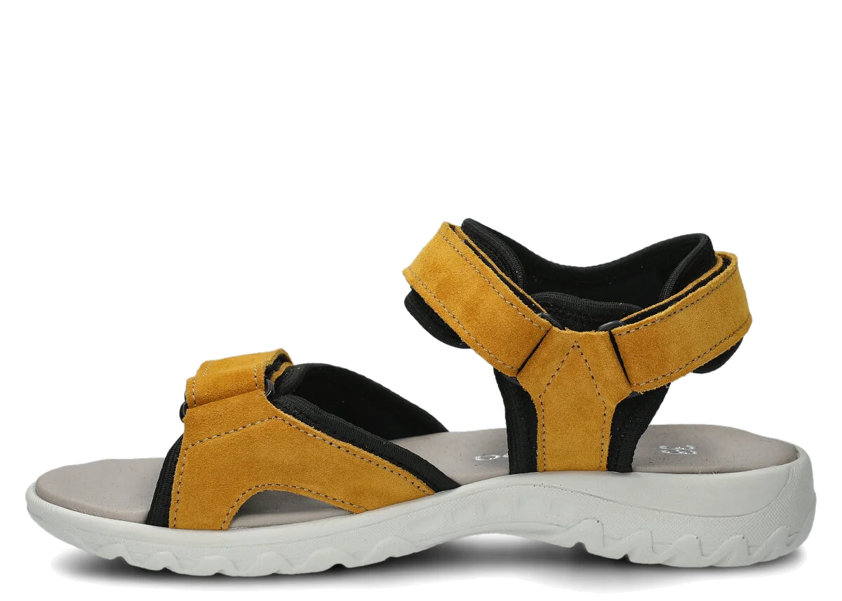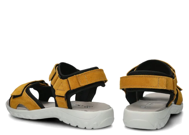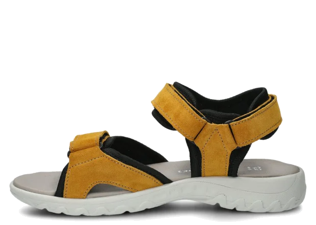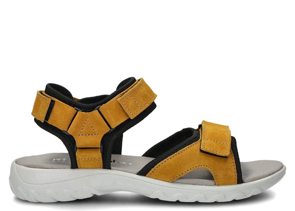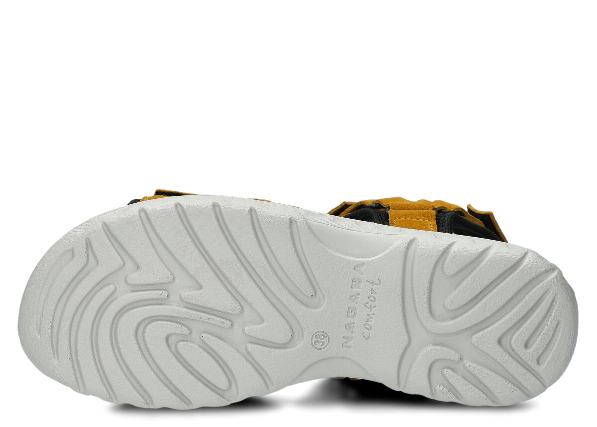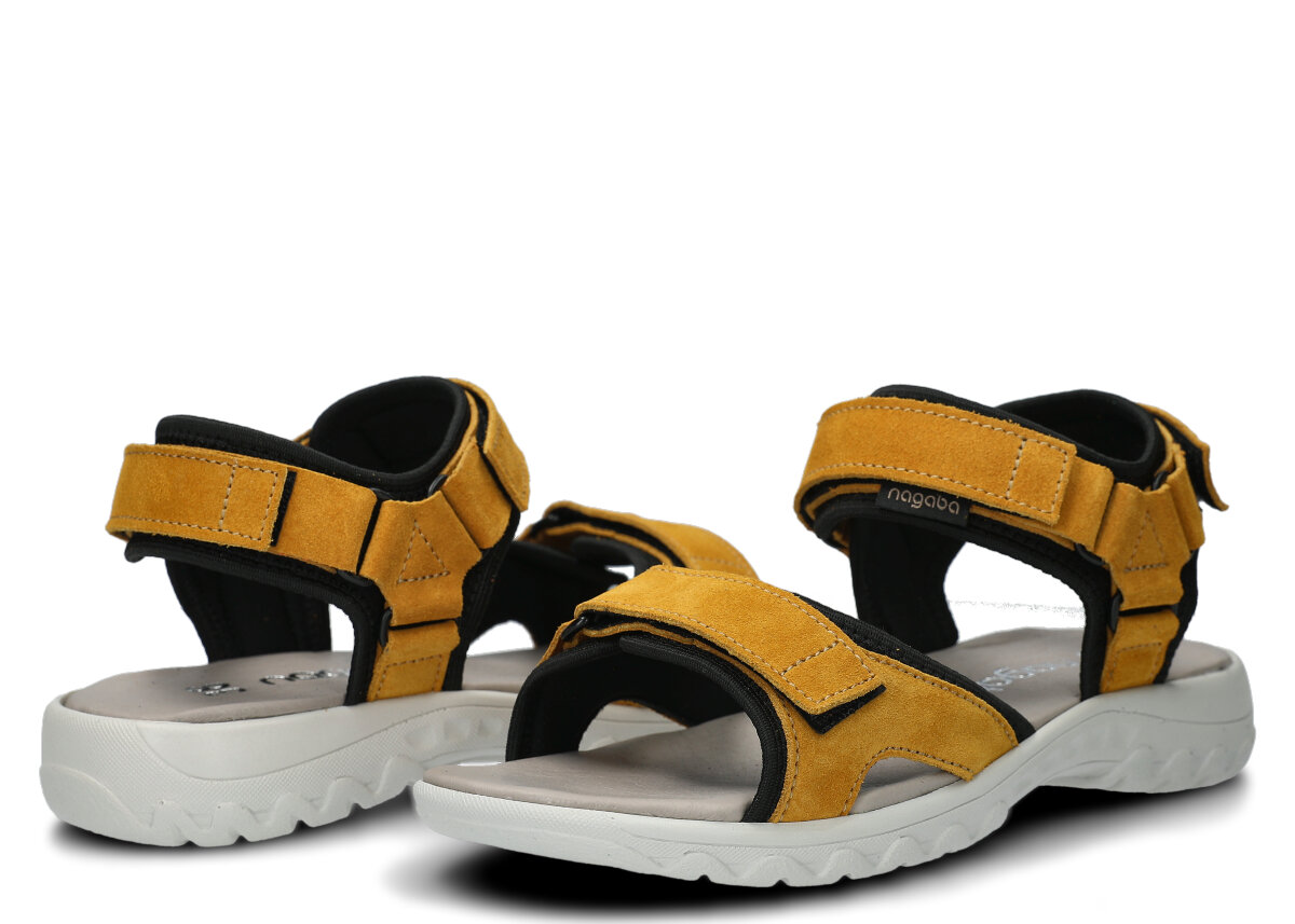 Díky použití pravé kůže jsou dámské sandály Nagaba model 266 v žluté semišové kůži nejen velmi elegantní, ale především vysoce funkční. Pravá kůže je hypoalergenní materiál bez škodlivých chemických látek, což zaručuje úplnou bezpečnost obuvi pro zdraví vašich nohou. Zároveň dámské sandály Nagaba model 266 v žluté semišové kůži nezpůsobují puchýře, otlaky ani podráždění. Tyto sandály se jednoduše a pohodlně obouvají pomocí suchých zipů, které umožňují dokonalé přizpůsobení noze. Tvarovaná a komfortní polyuretanová podrážka v univerzální šedé barvě zajišťuje lehkost a pružnost při chůzi.