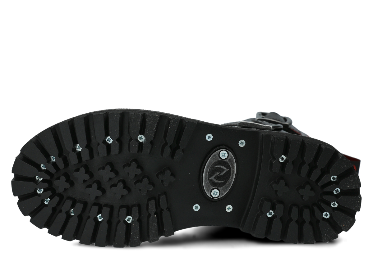 Protiskluzová podešev z pravé gumy je ozdobena dekorativními šrouby a charakteristickým kovovým logem, což dodává botám jedinečný charakter.