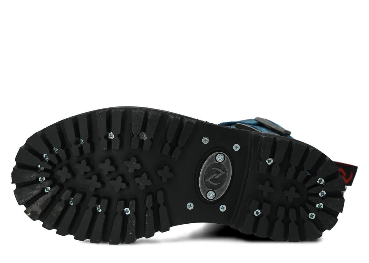 Protiskluzová podešev z pravé gumy je ozdobena dekorativními šrouby a charakteristickým kovovým logem, což dodává botám jedinečný charakter.