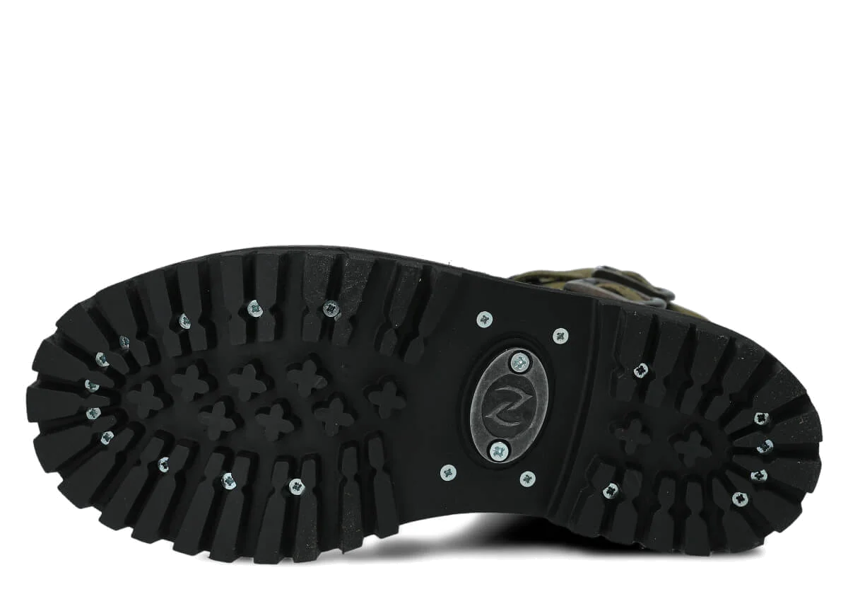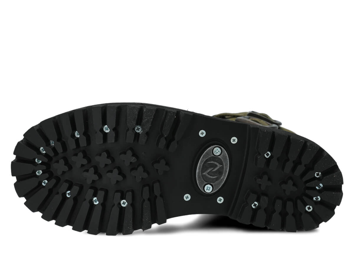 Protiskluzová podešev z pravé gumy je ozdobena dekorativními šrouby a charakteristickým kovovým logem, což dodává botám jedinečný charakter.