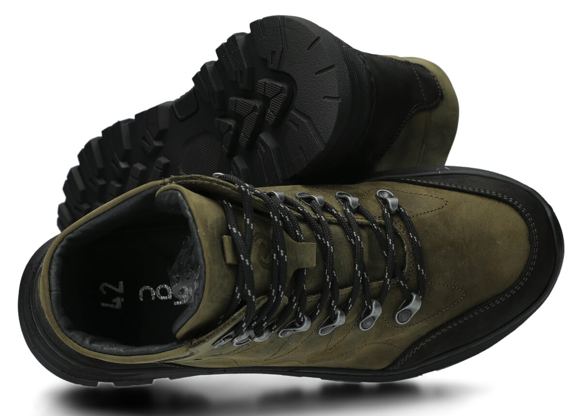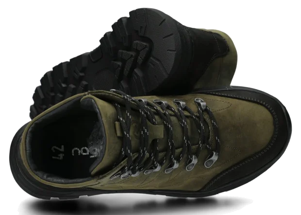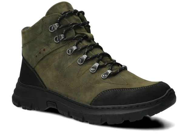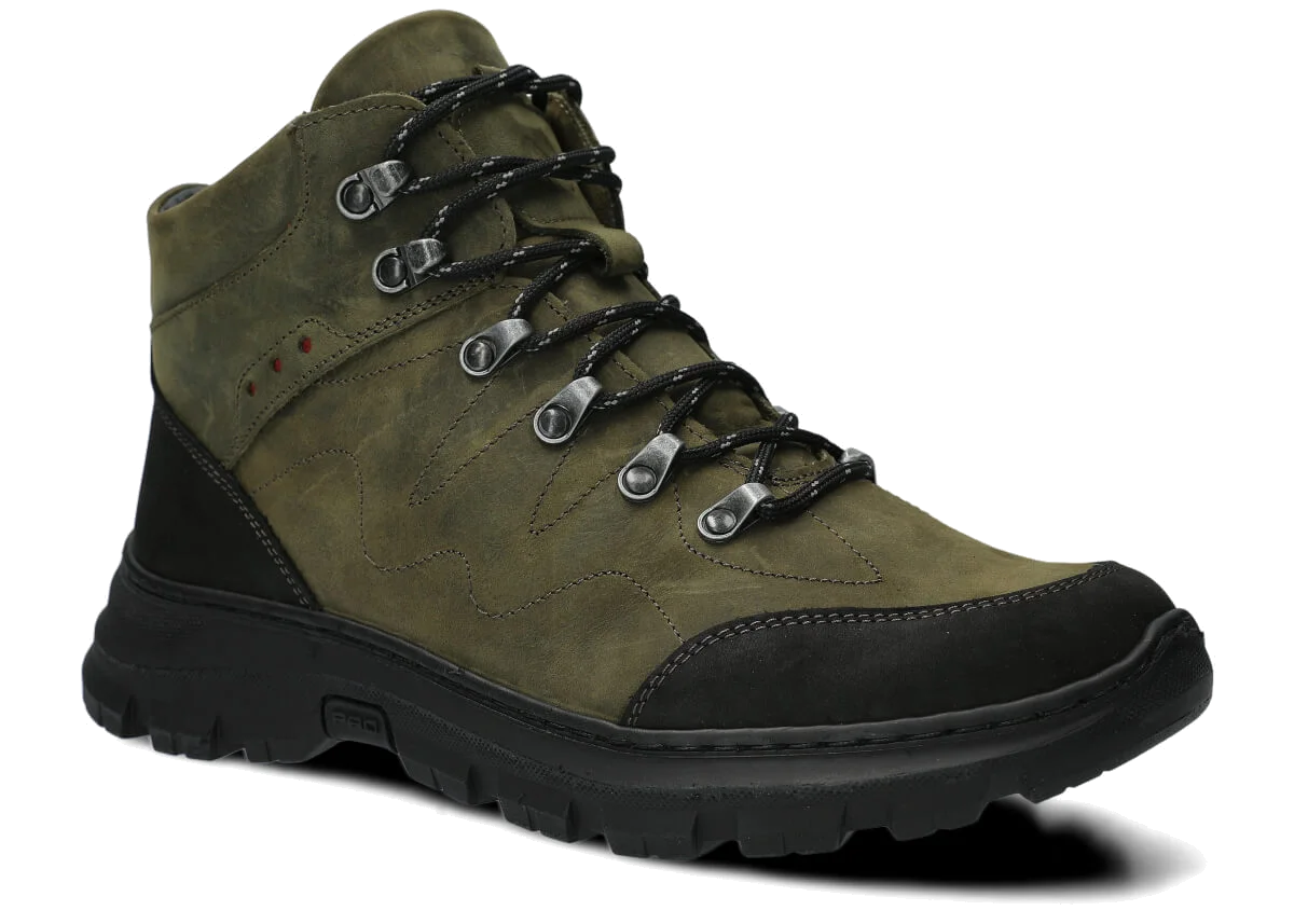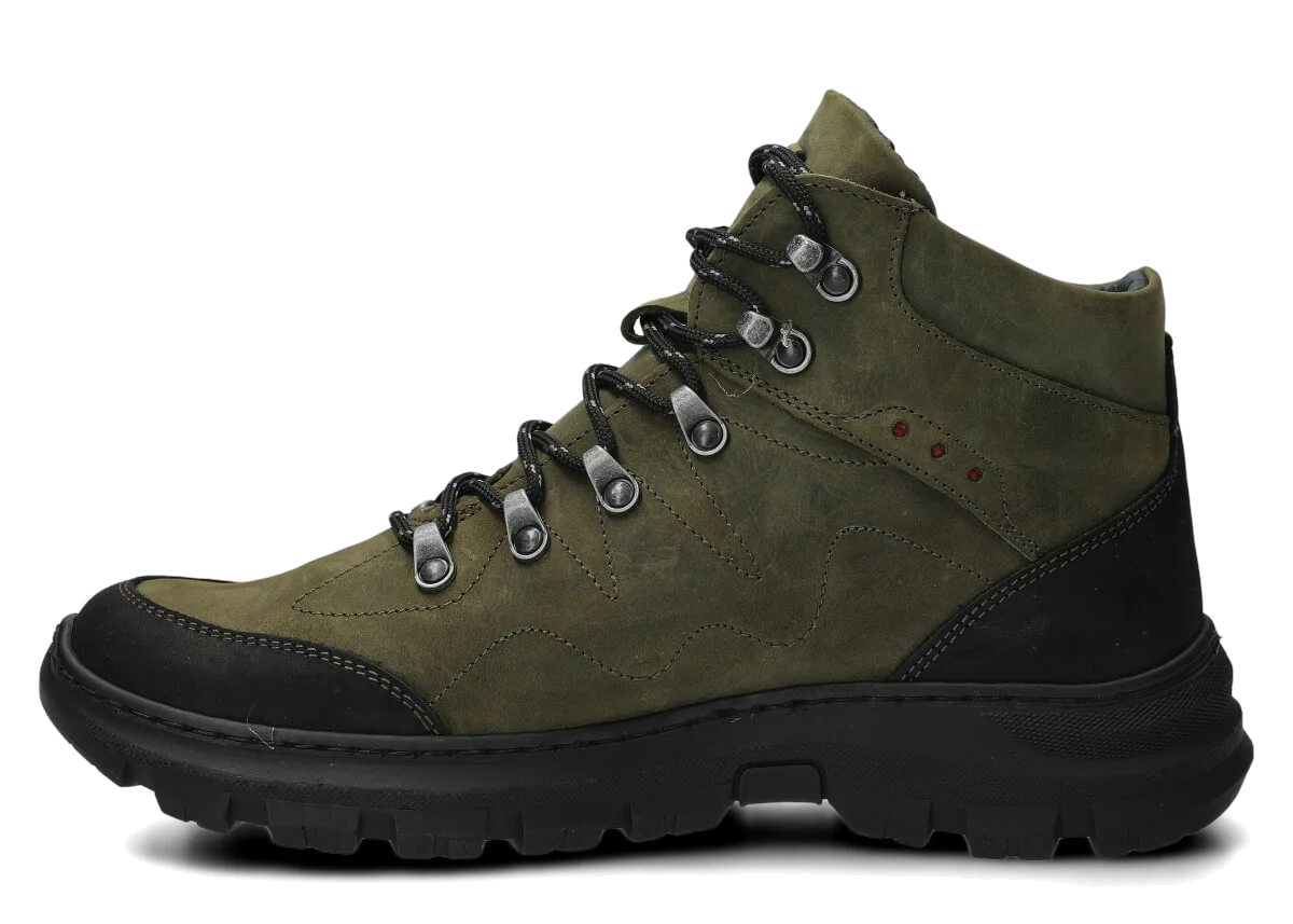 Trekové boty pánské kožené Nagaba 4091 olivová zelená crazy jsou mistrovským dílem řemeslné práce – ručně vyrobené v Polsku z odolné přírodní kůže typu crazy. Obuv nad kotník s volitelným zateplením (filc nebo kůže) a protiskluzovou podrážkou TR-termokaučuk – ideální na podzim, zimu a jaro. Dominantní olivová zelená barva s černými akcenty na špičce a patě, černé tkaničky a černá podrážka vytvářejí moderní, outdoorový vzhled.