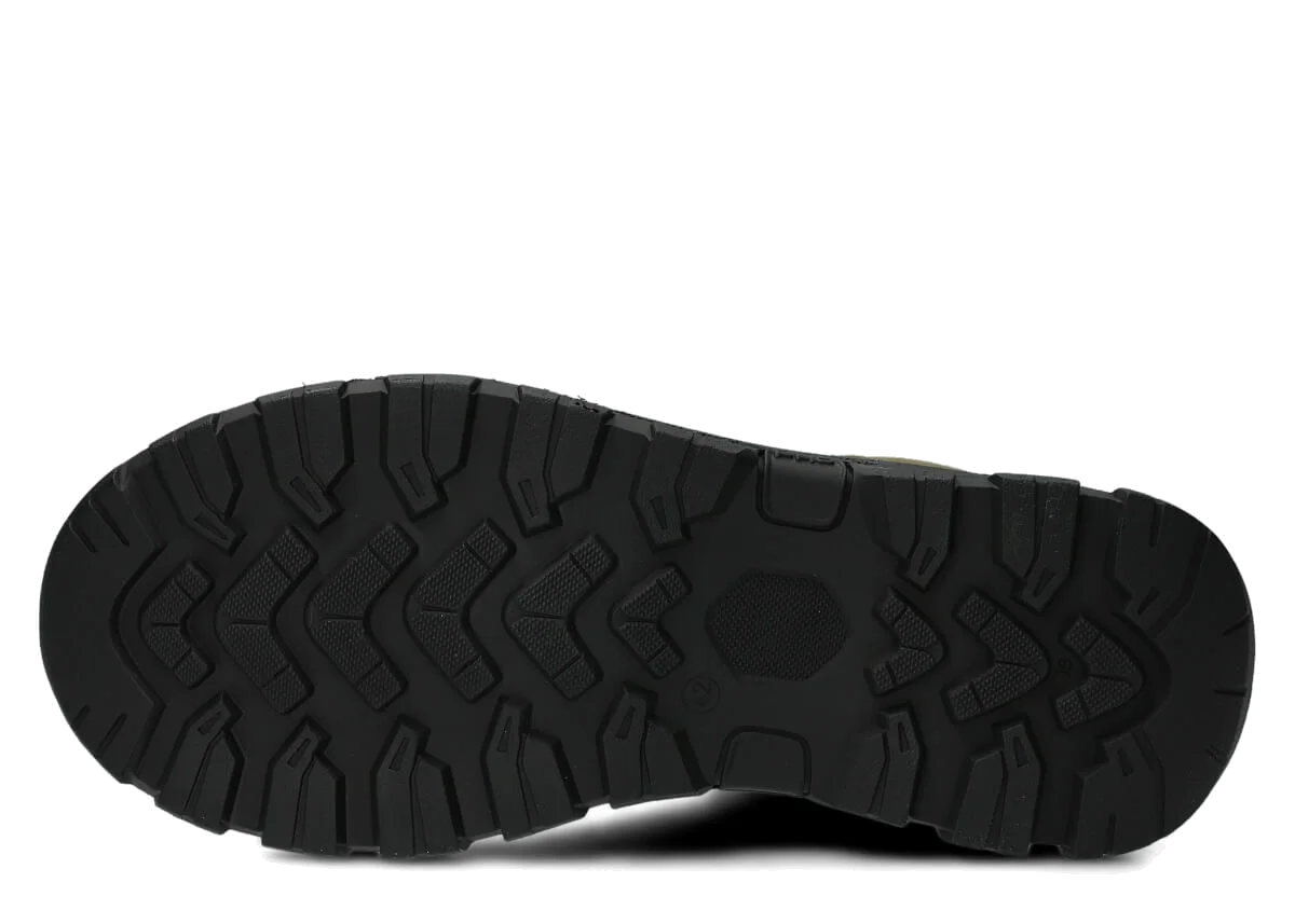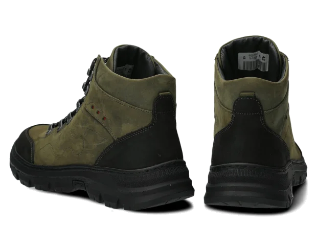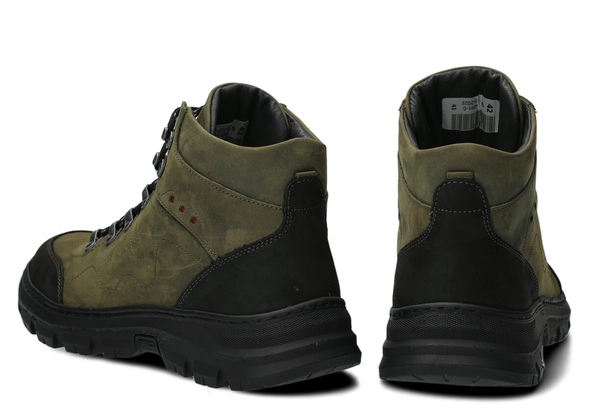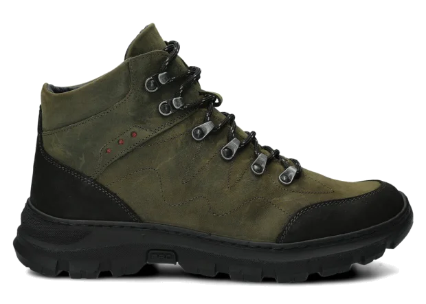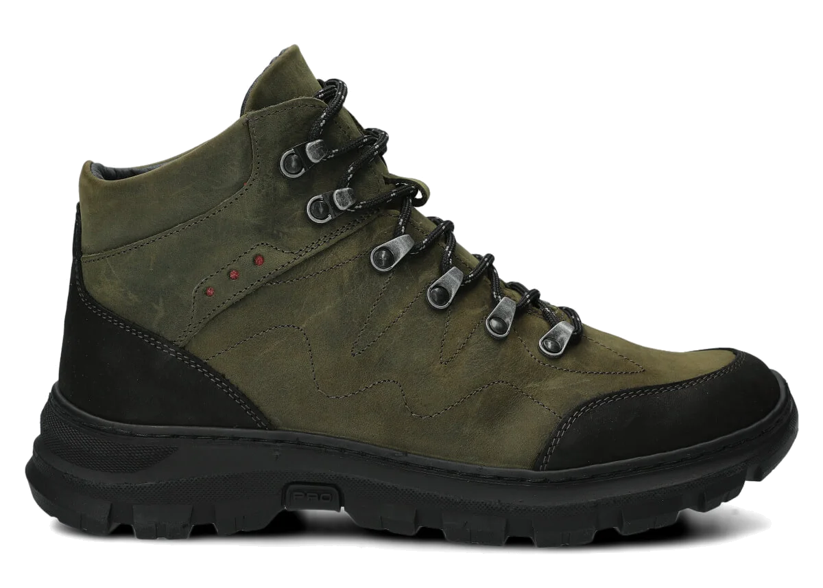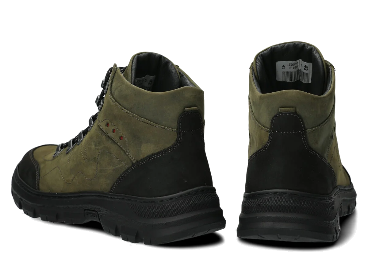 Trekové boty pánské kožené Nagaba 4091 olivová zelená crazy jsou mistrovským dílem řemeslné práce – ručně vyrobené v Polsku z odolné přírodní kůže typu crazy. Obuv nad kotník s volitelným zateplením (filc nebo kůže) a protiskluzovou podrážkou TR-termokaučuk – ideální na podzim, zimu a jaro. Dominantní olivová zelená barva s černými akcenty na špičce a patě, černé tkaničky a černá podrážka vytvářejí moderní, outdoorový vzhled.