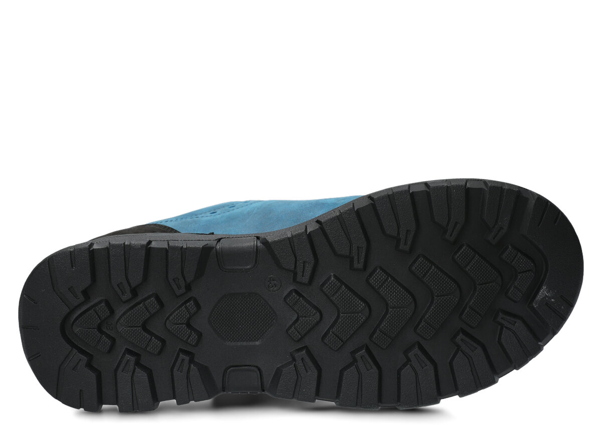 Tyto pánské trekkingové boty se vyznačují jedinečným designem. Svršek kombinuje dvě přírodní kůže: dominantní kobalt černou na špičce a patě boty, což jim dodává moderní, sportovní charakter. Černé tkaničky a kontrastní černá podrážka doplňují stylový vzhled, který se hodí jak na stezku, tak do městských stylizací.